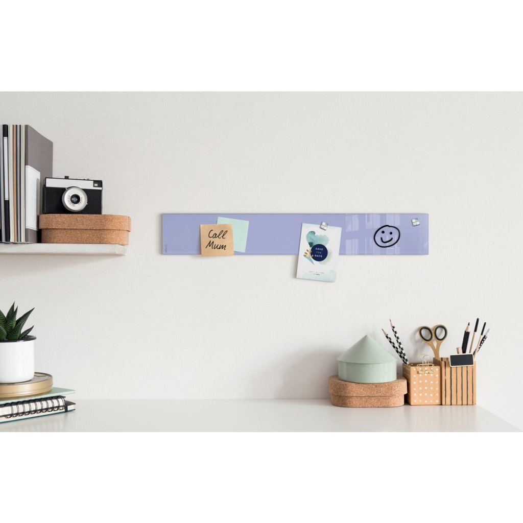 Ideaal als modern alternatief voor het prikbord om gedachten in het homeoffice te visualiseren of to-do’s overzichtelijk te presenteren. Het hoogglans glas-magneetbord uit de internationaal bekroonde Artverum-serie in het formaat 12 x 78 cm in lavendel is eenvoudig te monteren in staand of liggend formaat met het meegeleverde bevestigingsmateriaal en met andere boards met dezelfde afstand tot de wand van 10 mm combineerbaar. Alleen magnetisch met sterke neodymium magneten, beschrijfbaar met krijt- en glasboardstiften, afneembaar met een vochtige of droge doek Frameloos voor een strak uiterlijk – alsof het voor de wand zweeft – en bijna naadloze beschrijfbaarheid op een magneetwand bestaande uit meerdere boards Gegarandeerde productveiligheid: TÜV- en GS-geteste veiligheidsophanging met gleuf voor het bijstellen van kleine boorfouten en voor een nagenoeg naadloze montage van meerdere magneetborden Hoogwaardig veiligheidsglas (ESG, EN 12150-1), met 4 mm glasdikte zeer robuust en krasbestendig Extreem duurzaam met 25 jaar garantie op het glasoppervlak bij gebruik van SIGEL accessoires Artverum is niet zomaar een glas-magneetboard maar een representatief designobject, waardoor u geïnspireerd zult raken.
